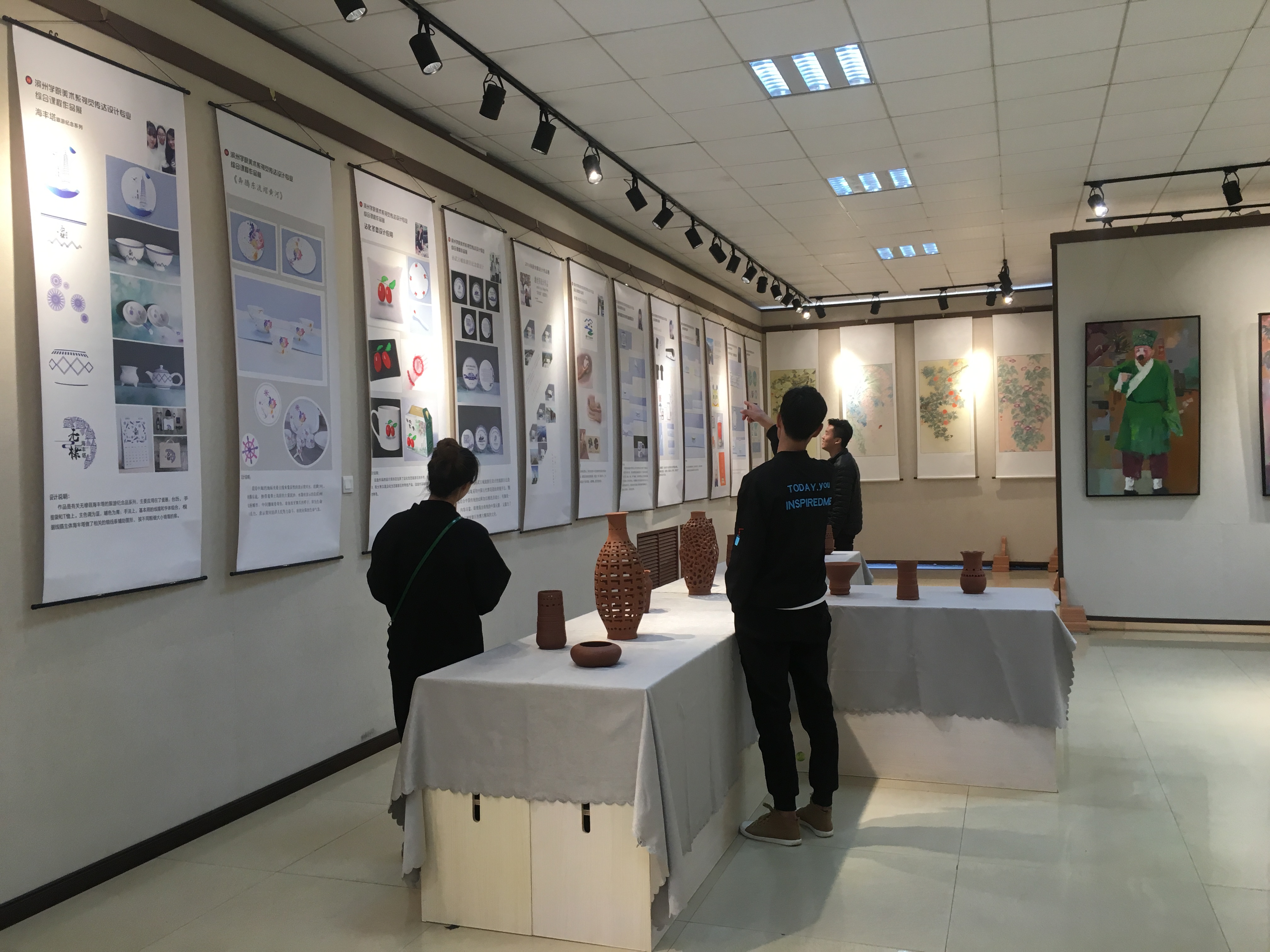 本次展览共展出2013、2014级美术学、环境艺术设计、视觉传达设计和数字媒体艺术4个专业学生作品70余件。作品中有表现黄河三角洲特色的油画作品,有色彩浓郁的油画戏曲人物,有写生滨院的国画四季锦歌,有具有现代造型特点的陶艺作品和水墨创作;也有优雅的铁艺家具与空间设计,有风格各异的视觉传达设计,还有现代数字媒体的形象展示等等。